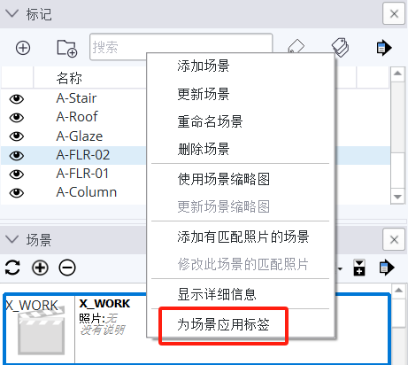 使用方法:设置标记(或标记文件夹)的可见性,选择单独的标记,然后选择想要应用到的特定场景。在标签或场景面板中点击右键,选择“为场景应用标签”,然后就大功告成了。当前选中标签的可见性被应用到选中的场景上,就这么简单!